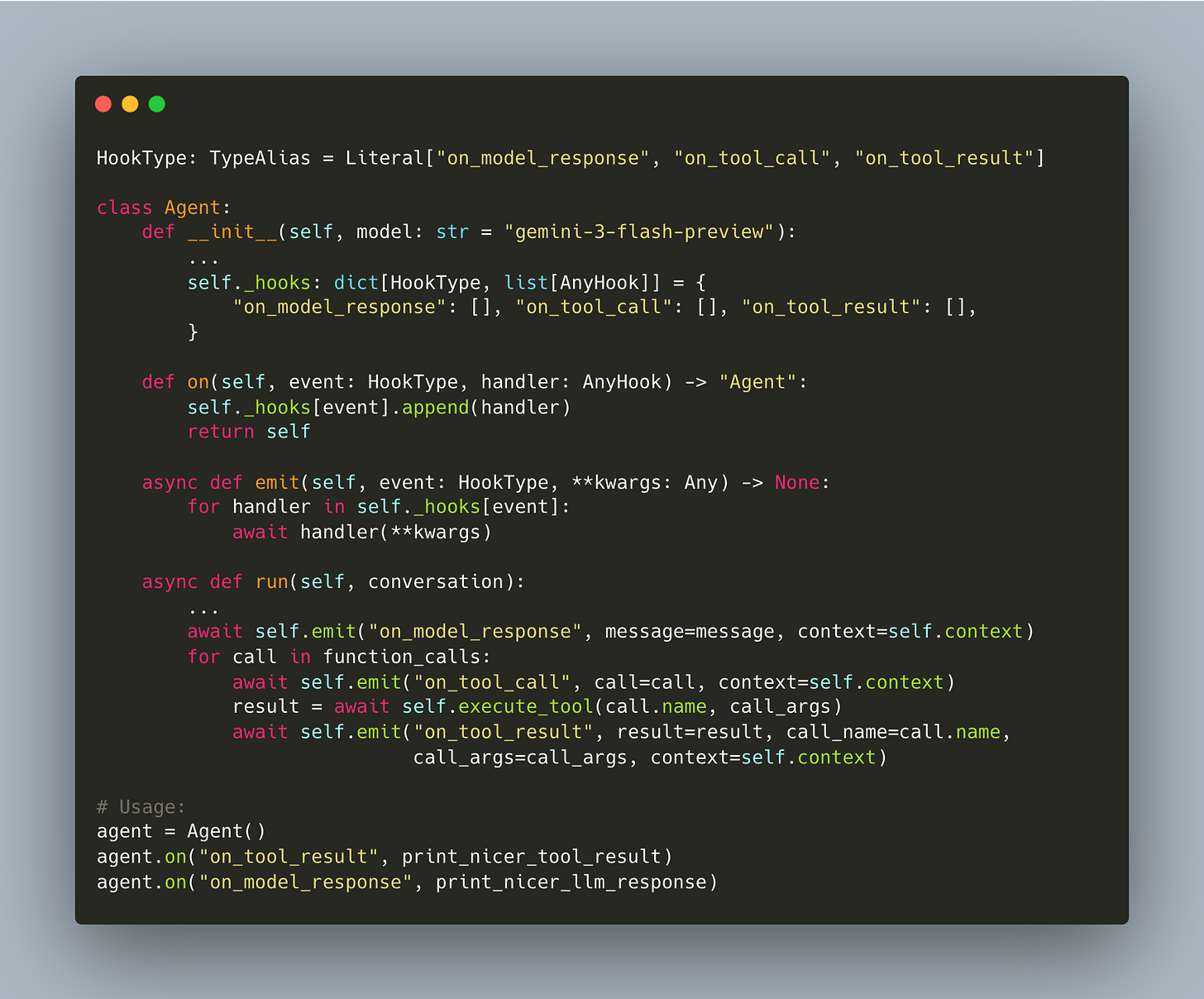 The run function no longer prints directly. Instead, it calls emit which triggers all async handlers registered for that event. The agent focuses on reasoning and execution, while the hooks handle side effects.