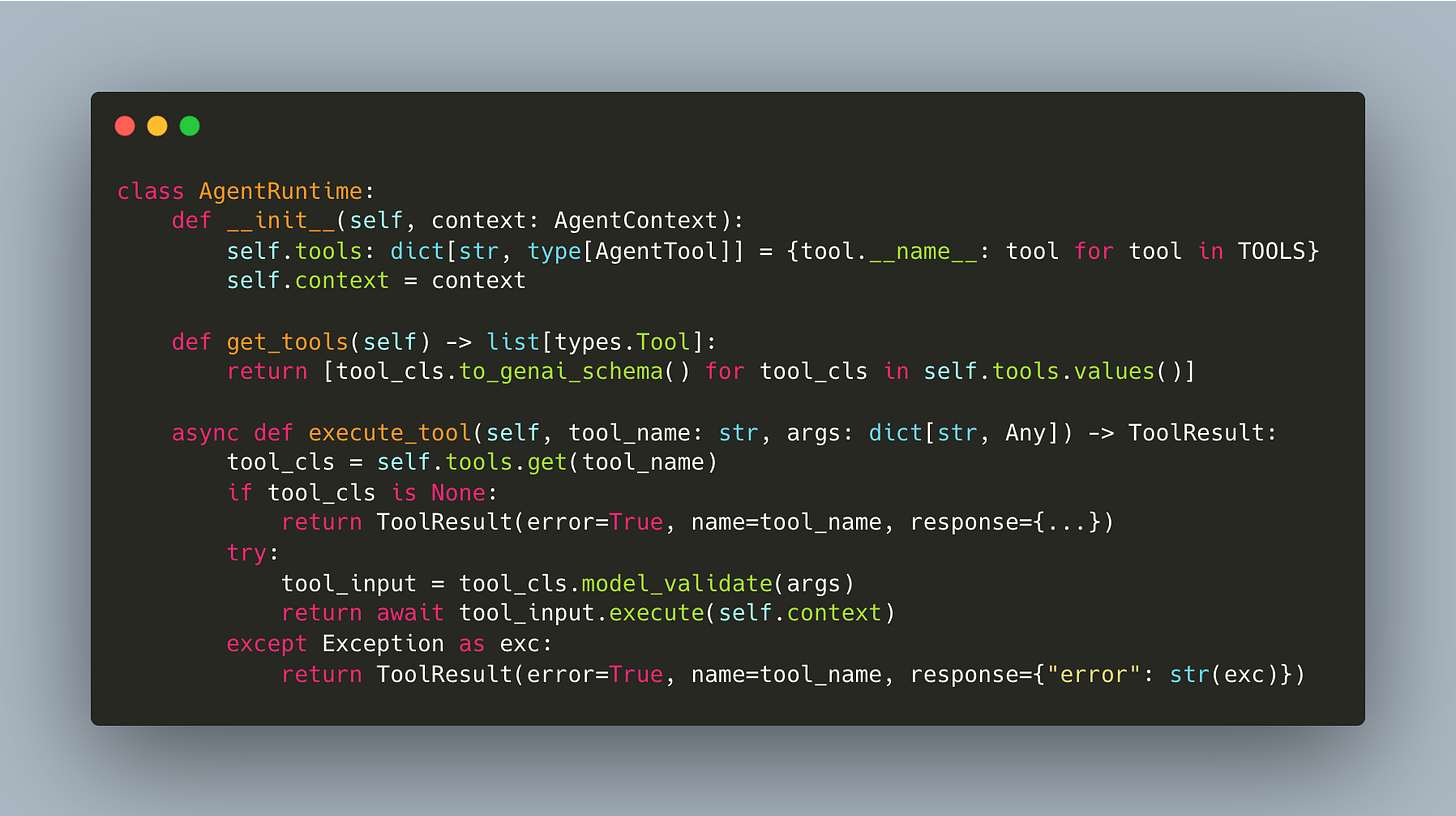 The AgentRuntime dispatches by name and validates args via Pydantic: it doesn’t know about specific tools (workshop/4/agent.py):