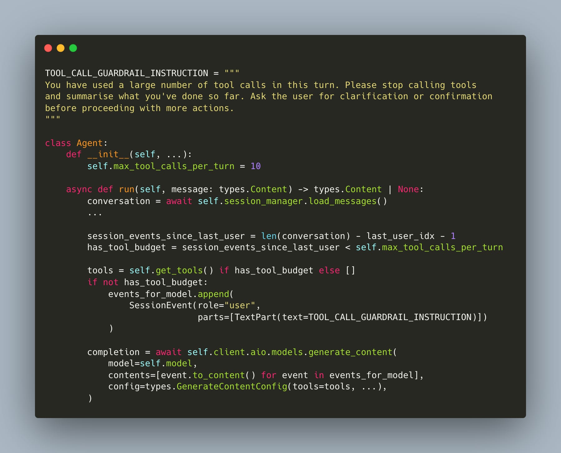 The final piece is preventing runaway tool loops. The agent tracks how many events have occurred since the last real user message. When the budget is exceeded, tools are removed entirely from the API call and a guardrail instruction is injected (workshop/12/agent.py):