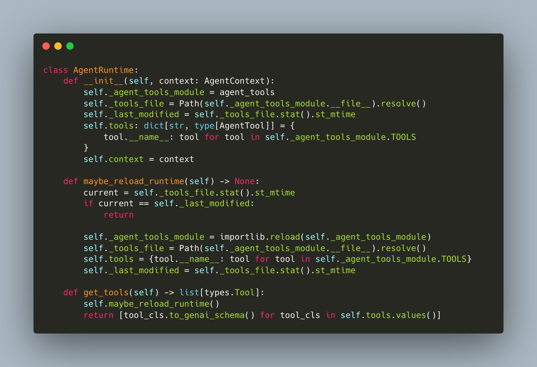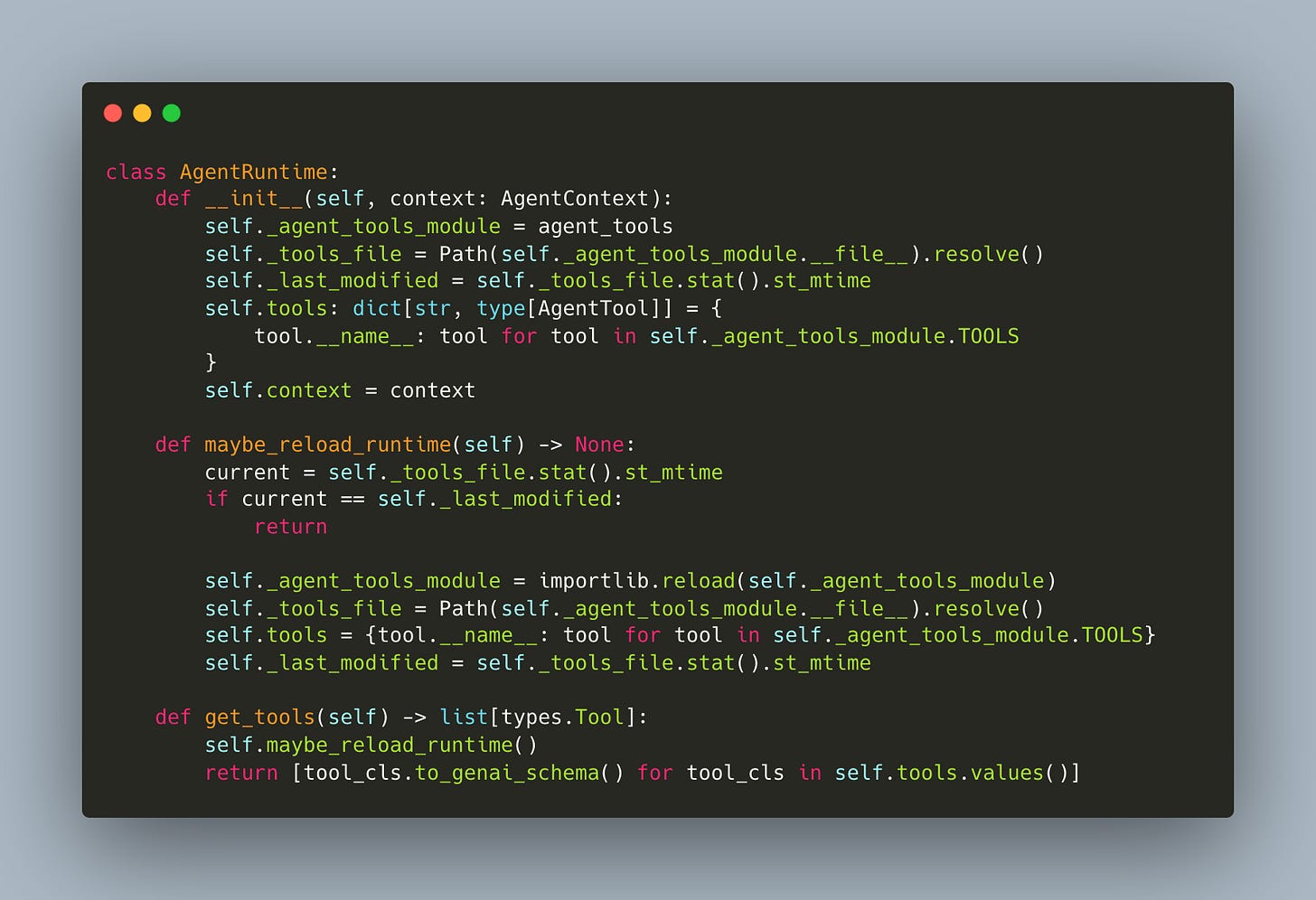 The mechanism is straightforward: the runtime tracks the last_modified timestamp of the agent_tools.py file where tool classes are defined and before every inference step, specifically when get_tools or execute_tool is called, the system checks if this timestamp has changed (workshop/6/agent.py):