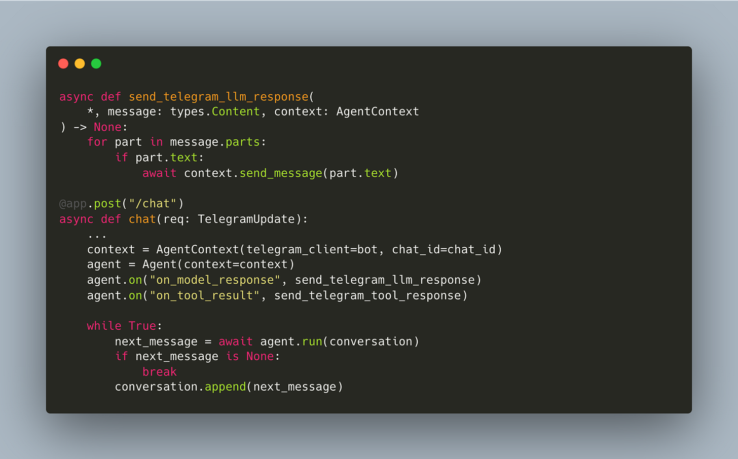 Then the webhook handler creates the context and registers hooks and that’s it (workshop/9/telegram_server.py):