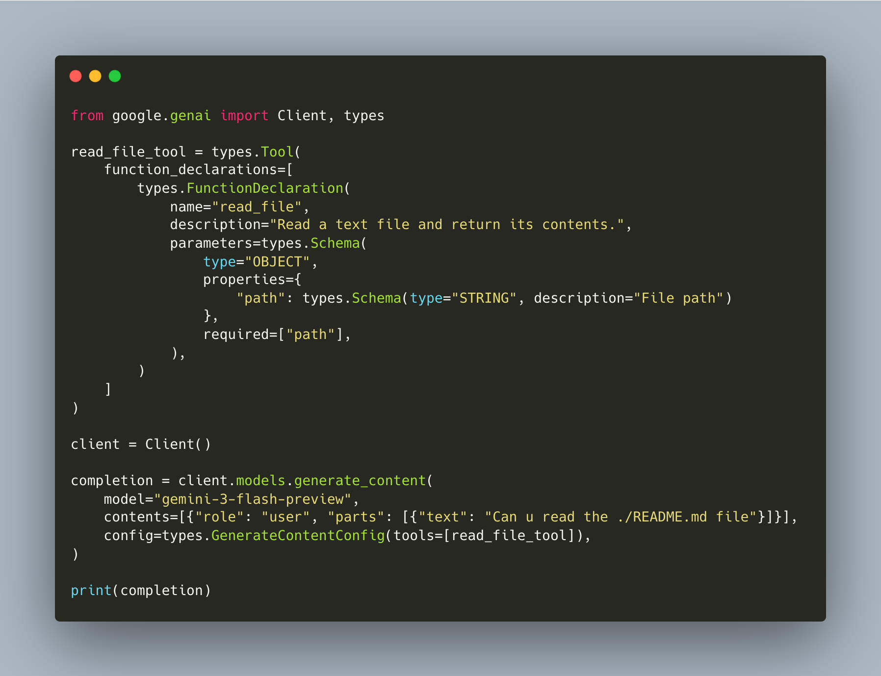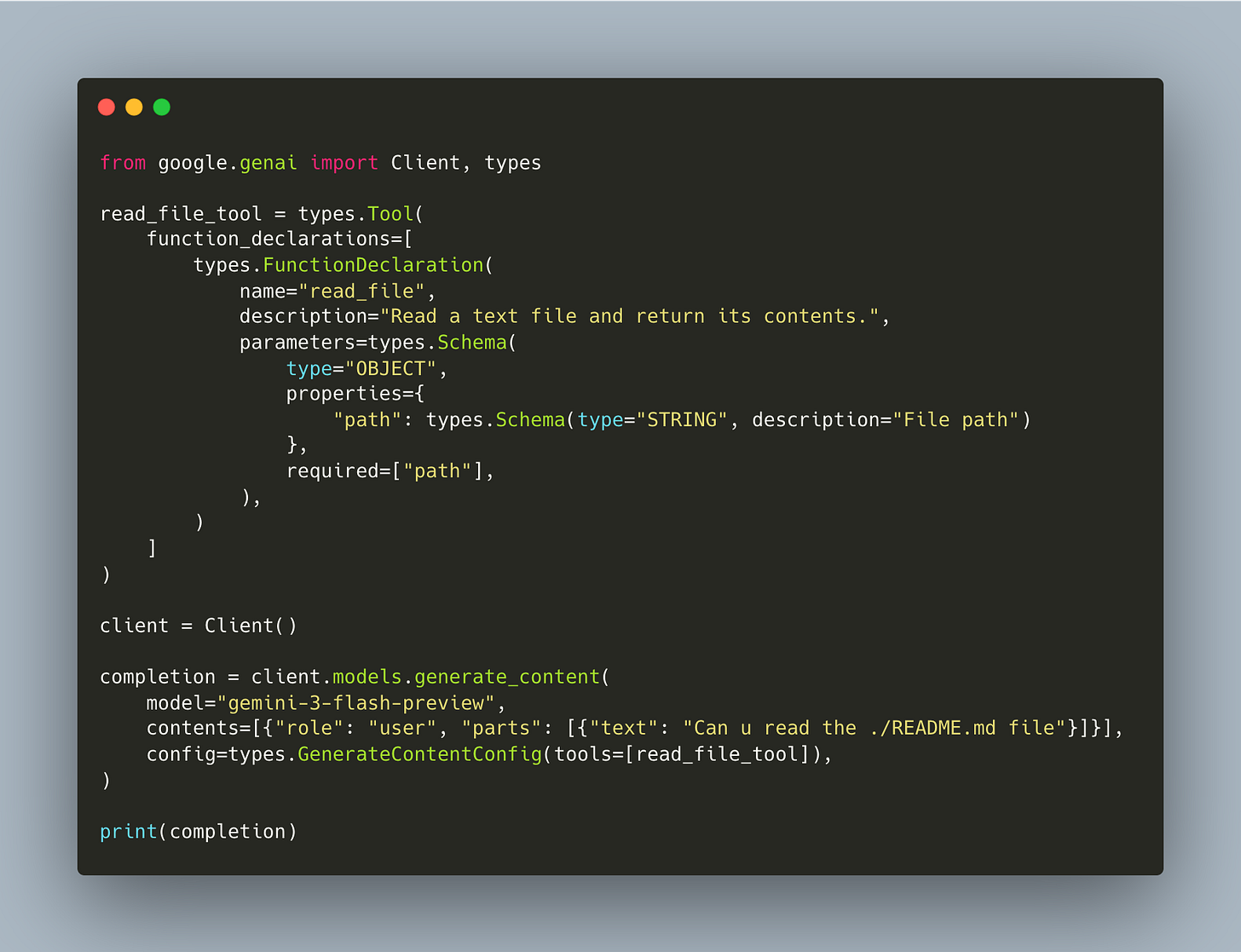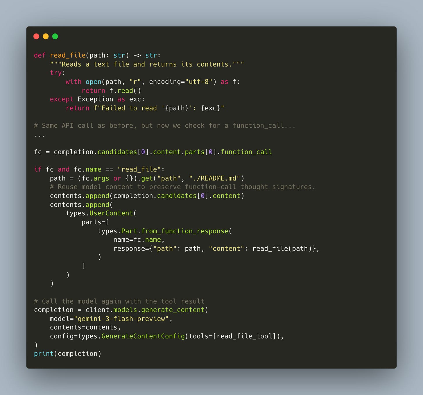 This is one manual round-trip: the model asks for a tool, we execute it, we send the result back. Notice the line contents.append(completion.candidates[0].content): that preserves the model’s thought signatures, which we’ll discuss next.
