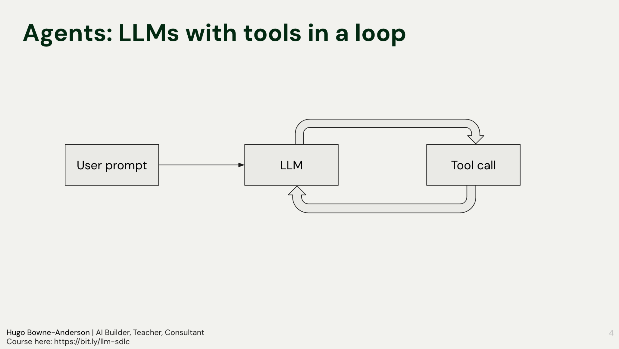 Remember that building an agent is building an LLM calling tools in a loop: you send a user prompt, the model decides to call a tool, you execute that tool, and you send the result back. This cycle continues until the model determines the task is complete or runs out of tokens.