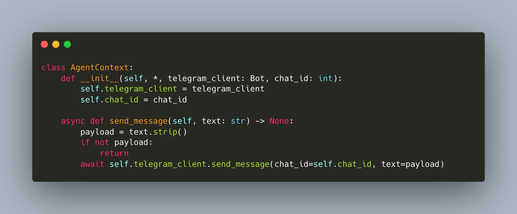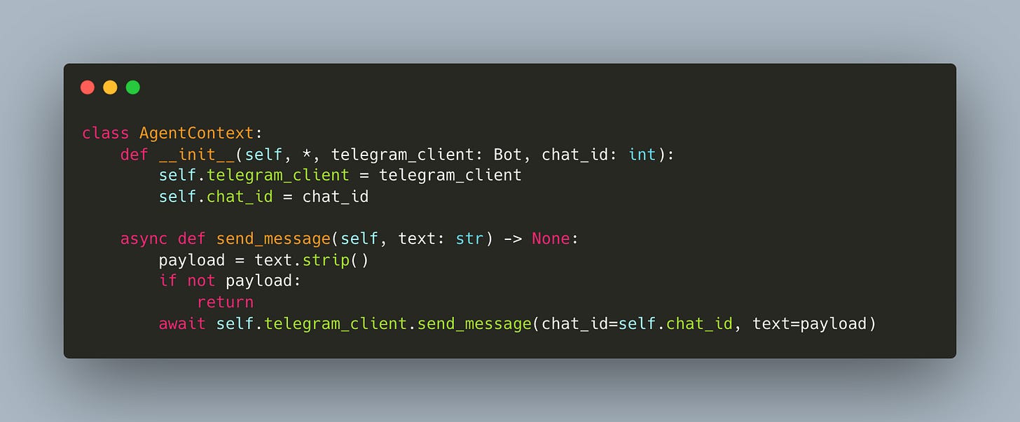 First, the AgentContext gets a Telegram client (workshop/9/agent_tools.py):