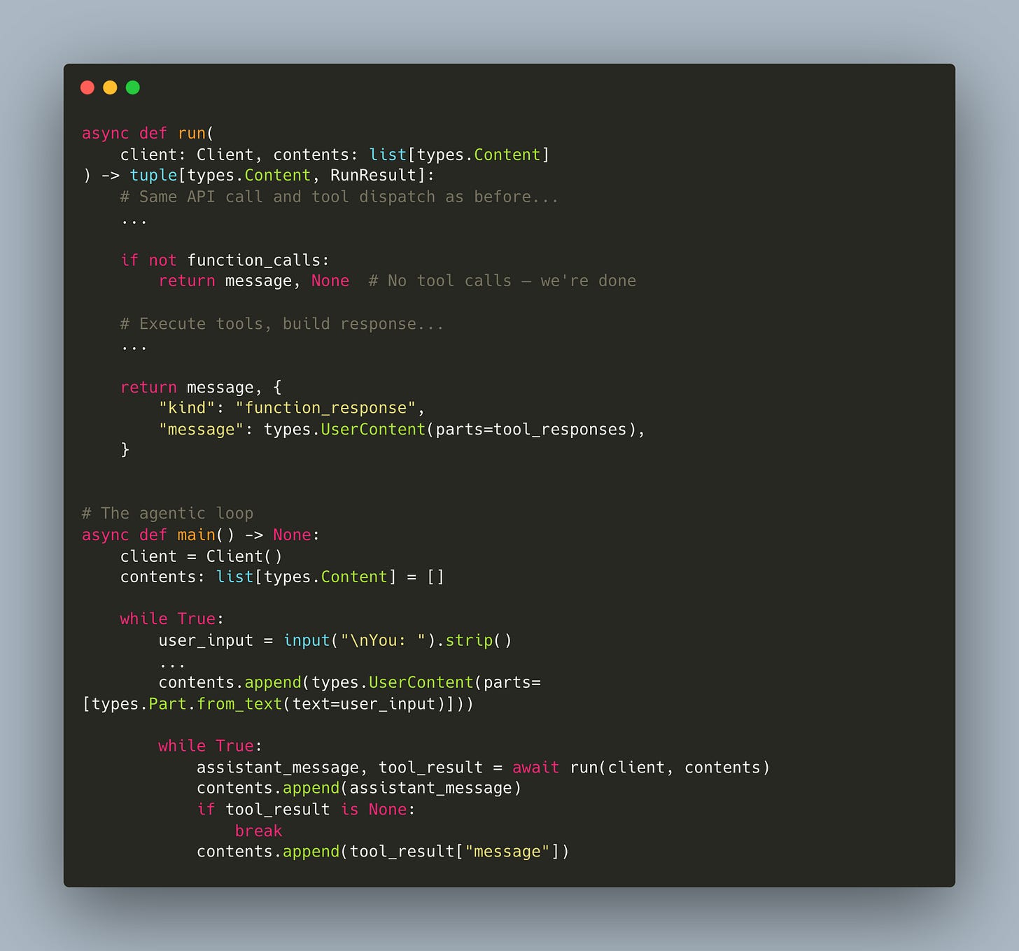 The inner while True keeps calling run() until the model is done. This is the agentic loop.