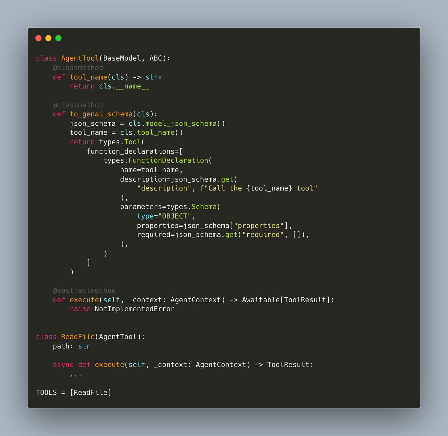 We refactored our agent so that tools are just classes. Each tool inherits from a base class, defines its parameters, and implements an execute method. The runtime uses Pydantic to automatically generate the function calling schemas from type hints. Because execution is separate from the schema, you can test each tool independently without invoking the LLM (workshop/4/agent_tools.py):